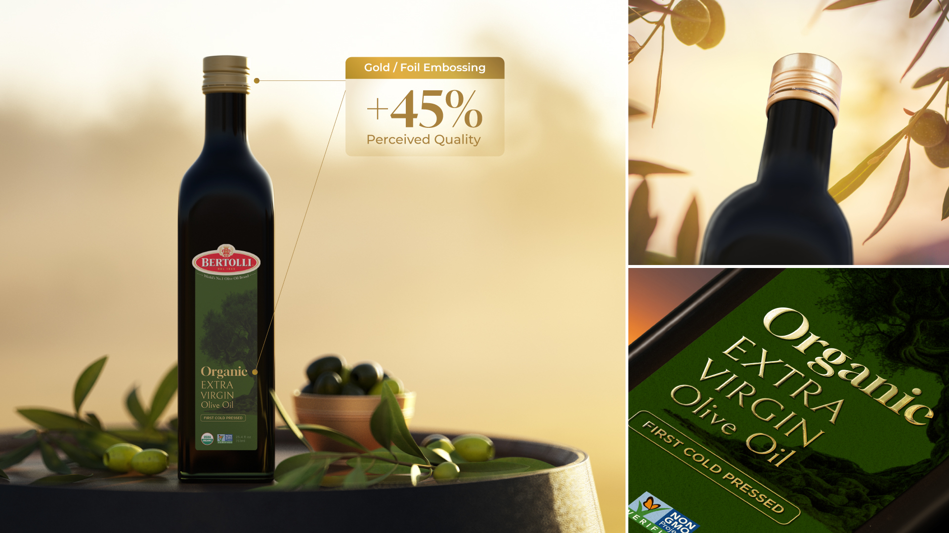 By simplifying the label content and prioritizing only the most essential information, shoppers can grasp the product’s key benefits within a second. Replacing generic single-olive imagery with an ancient olive tree illustration reinforces the product’s authentic origin and heritage. The introduction of a gold textured finish further elevates perceived quality and increases shelf engagement time.